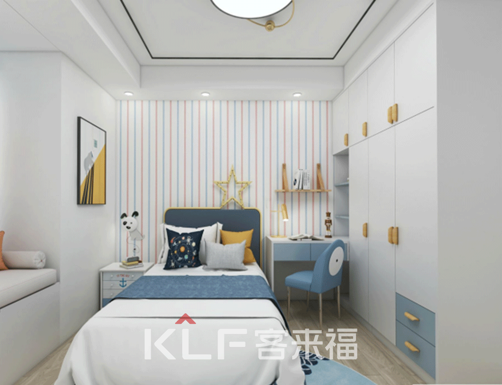 看完客廳往更深處來就是夫妻二人的主臥,以及兒童房了。主臥中冷色調(diào)以及暖色調(diào)的搭配,使得房間看起來更加溫馨,因為房間內(nèi)有一個大轉(zhuǎn)角,所以我們用整體式衣柜設(shè)計,將這個轉(zhuǎn)角藏了起來。但也因禍得福,讓房間更具有空間的美感,同時還增加了收納空間。兒童房的設(shè)計采用了簡潔的童話風,讓房間內(nèi)的色彩更加豐富,活潑鮮艷。