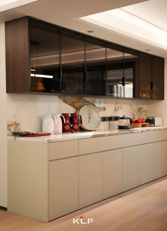 餐廳布局強(qiáng)調(diào)動(dòng)線流暢,通過簡(jiǎn)化形式、強(qiáng)化功能與自然元素,實(shí)現(xiàn)功能與美學(xué)的無縫契合。木作餐邊柜搭配奢石臺(tái)面,材質(zhì)與色彩的對(duì)比,增強(qiáng)空間層次而不顯雜亂?。干凈的色調(diào),利落的線條,彰顯住而有品的格調(diào)。