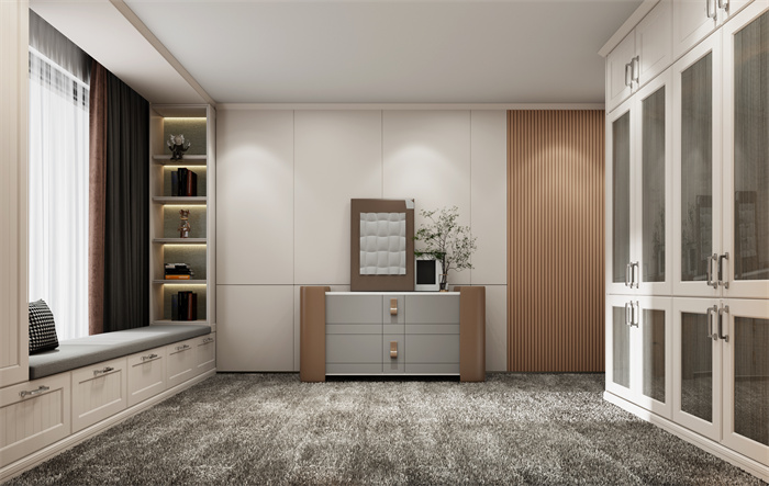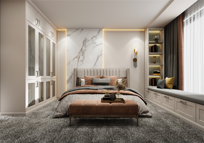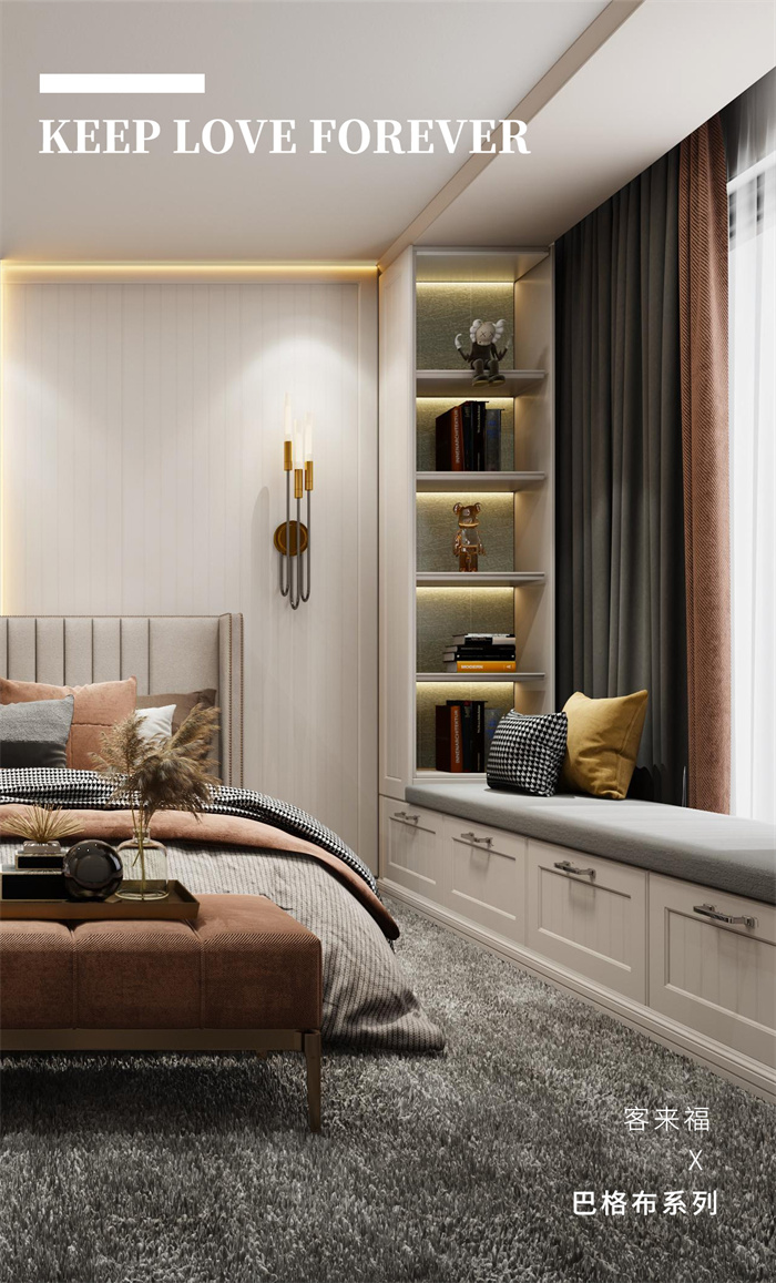 臥室的柵格背景墻和模壓護(hù)墻,做出了?定混油的產(chǎn)品效果,超晶板和巖板等超現(xiàn)代感的元素的融入, 更是將簡歐這?經(jīng)典風(fēng)格產(chǎn)品做了顛覆,更符合當(dāng)下消費(fèi)?群讓客戶生活更加自然。
