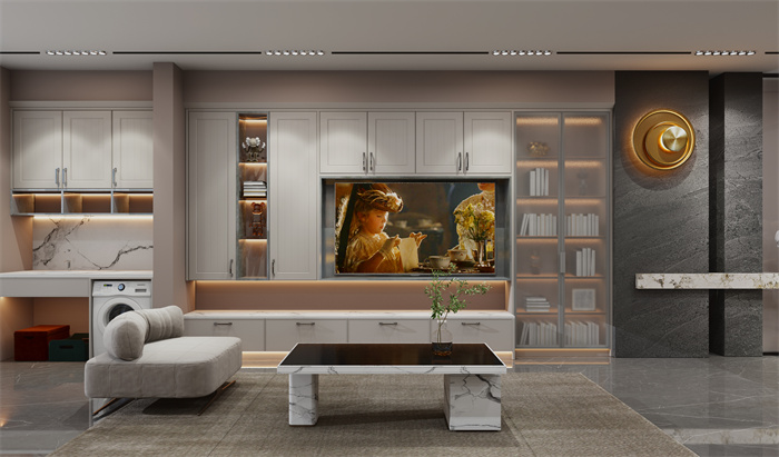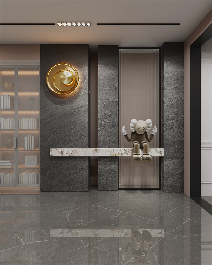 ?戶空間造景區(qū)與鞋柜相互呼應(yīng),精致的?虹玻璃作為情緒與視覺的點(diǎn)睛,填充空間空?的同時,也衍生出生活美學(xué)的設(shè)計(jì)感與儀式感。