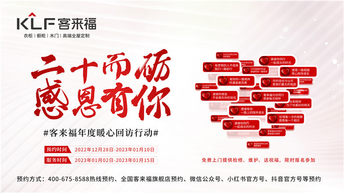 想要參與客來(lái)福一年一度的“感恩行動(dòng)”,只需在2023年1月10日前進(jìn)行報(bào)名預(yù)約,客來(lái)福家居將積極走進(jìn)更多家庭,切實(shí)維護(hù)產(chǎn)品性能,讓家人們安心過(guò)年,幸福過(guò)年!