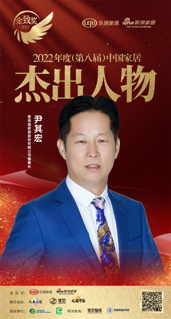2022年12月26日,『趁勢·再起——2022中國家居新時代盛典暨金致獎頒獎典禮』在云端盛大舉行??蛠砀<揖右浜陿s獲「2022(第八屆)中國家居杰出人物」稱號。