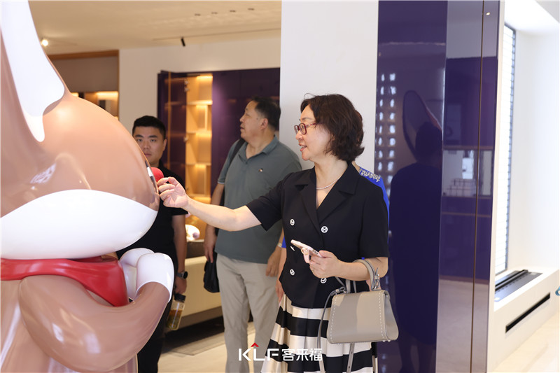 走到文化長(zhǎng)廊時(shí),眾人一起感受客來(lái)福的文化底蘊(yùn),并通過(guò)觸摸板材體會(huì)水漆產(chǎn)品的質(zhì)感;走到2023年新落地的13代展廳時(shí),品牌元素的融合設(shè)計(jì),讓人眼前一亮。