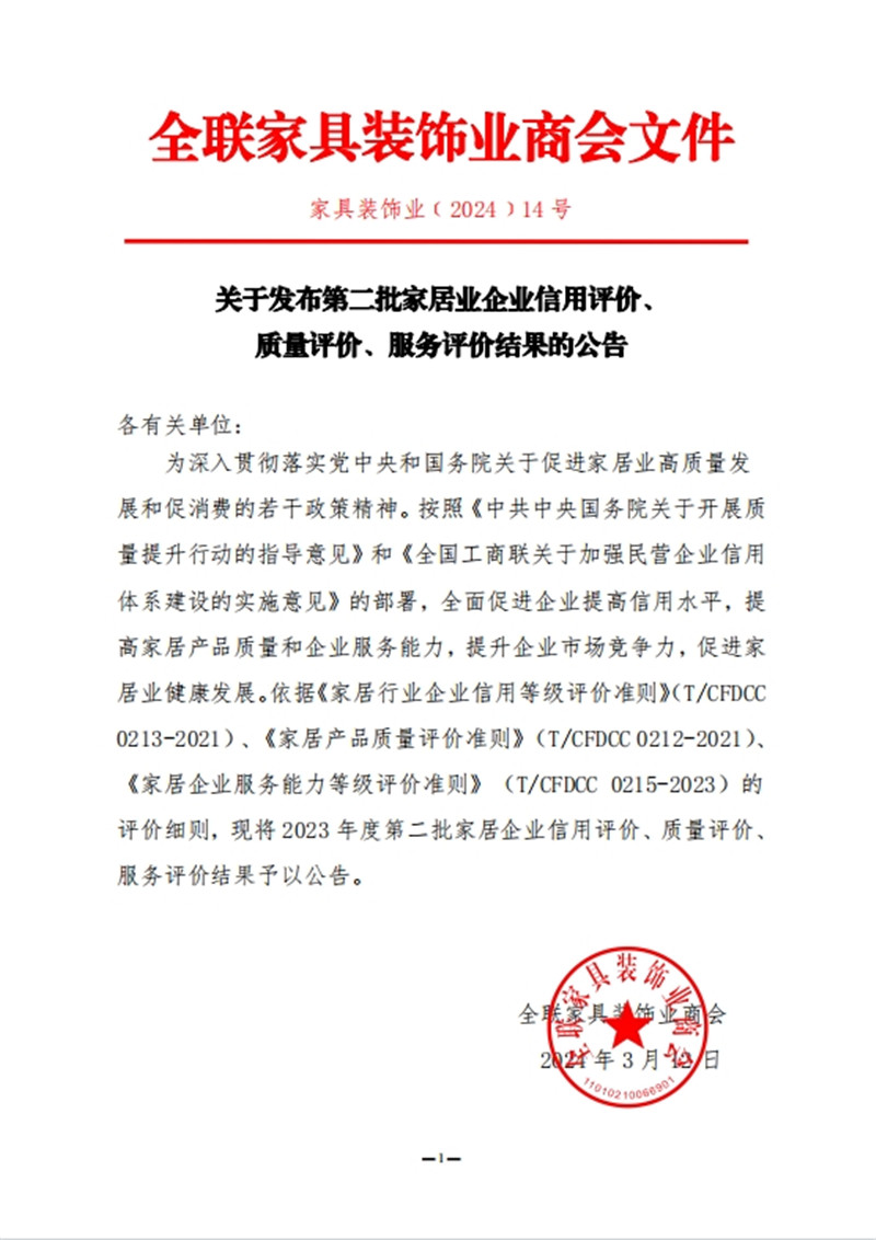 為深入貫徹落實(shí)黨中央和國(guó)務(wù)院關(guān)于促進(jìn)家居業(yè)高質(zhì)量發(fā)展和促消費(fèi)的若干政策精神,按照《中共中央國(guó)務(wù)院關(guān)于開(kāi)展質(zhì)量提升行動(dòng)的指導(dǎo)意見(jiàn)》和《全國(guó)工商聯(lián)關(guān)于加強(qiáng)民營(yíng)企業(yè)信用體系建設(shè)的實(shí)施意見(jiàn)》的部署,全面促進(jìn)企業(yè)提高信用水平,提高家居產(chǎn)品質(zhì)量和企業(yè)服務(wù)能力,提升企業(yè)市場(chǎng)競(jìng)爭(zhēng)力,促進(jìn)家居業(yè)健康發(fā)展。依據(jù)《家居行業(yè)企業(yè)信用等級(jí)評(píng)價(jià)準(zhǔn)則》(T/CFDCC0213-2021)、《家居產(chǎn)品質(zhì)量評(píng)價(jià)準(zhǔn)則》(T/CFDCC 0212-2021)、《家居企業(yè)服務(wù)能力等級(jí)評(píng)價(jià)準(zhǔn)則》(T/CFDCC 0215-2023)的評(píng)價(jià)細(xì)則,全聯(lián)家具裝飾業(yè)商會(huì)公布2023 年度第二批家居企業(yè)信用評(píng)價(jià)、質(zhì)量評(píng)價(jià)、服務(wù)評(píng)價(jià)結(jié)果,客來(lái)福家居評(píng)獲定制家居行業(yè)信用評(píng)價(jià)5A、產(chǎn)品質(zhì)量評(píng)價(jià)5星、服務(wù)能力評(píng)價(jià)5星榮譽(yù)。