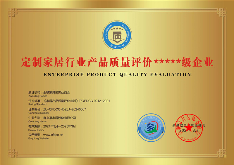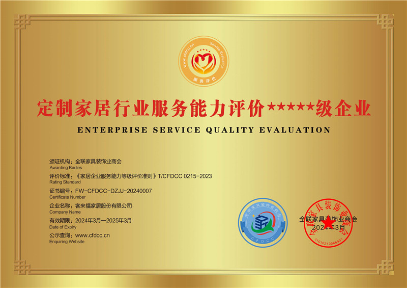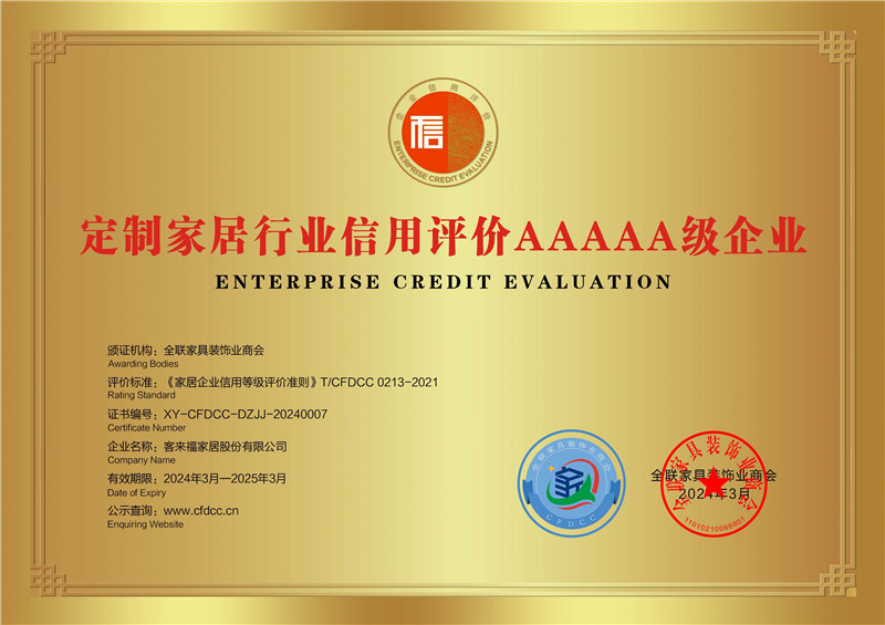 祝賀!客來(lái)福評(píng)獲定制家居行業(yè)信用評(píng)價(jià)5A、產(chǎn)品質(zhì)量評(píng)價(jià)5星、服務(wù)能力評(píng)價(jià)5星榮譽(yù)
